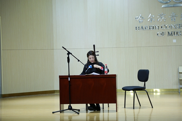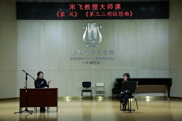 讲座上,宋飞教授围绕实际教学问题,为校内师生讲解“双语”教学模式,融合传统和西方的音乐元素,让师生了解、体会东西音乐文化的异同之处,从而更好地运用不同的音乐语言技巧来表达音乐、诠释音乐的内涵。随后,2015级本科生吴珊演奏了《第三二胡狂想曲》,宋飞教授进行了现场点评,并从作品风格等方面进行讲解,详细解释由远及近,情景交融的诠释方法。接着,宋飞教授以《空山鸟语》《一枝花》《听松》做示范,重点讲解在经典二胡作品中使用的不同技巧和内在细节的表现方法。